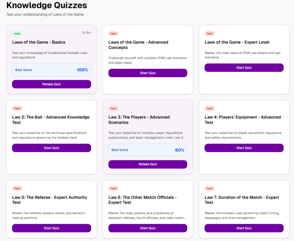 RefZone generates custom quizzes based on what you need work on. These quizzes help you improve your theoretical knowledge of the LOTG.