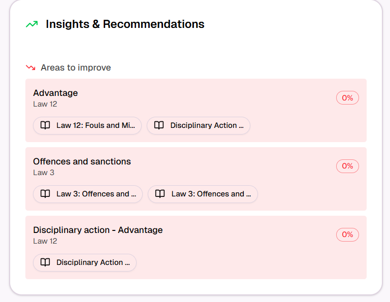 Our RefZone algorithm tracks your weaknesses and strengths based on how you do in the scenarios and quizzes you complete. It then suggests and generates quizzes for you to improve.